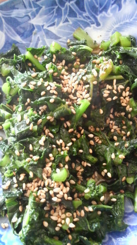 3:ある程度火が通ったら醤油を入れて、ざっとかき混ぜて出来上がり。盛り付けた後に炒りゴマをふりかけました。